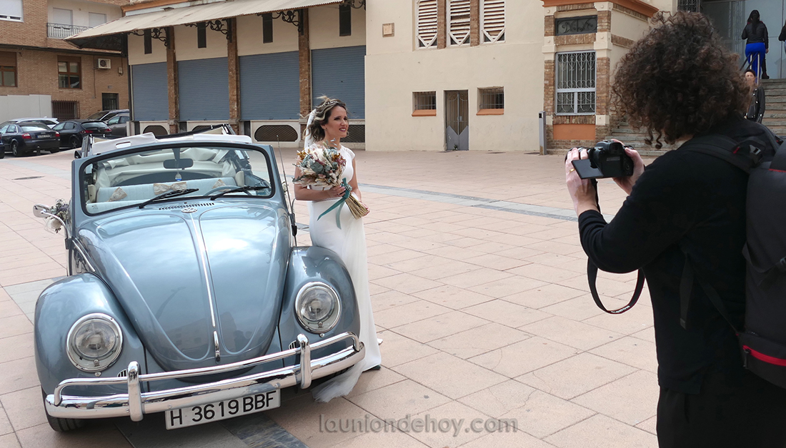 La unionense Maricarmen fue objeto de un reportaje de fotos con un coche clásico ante el modernista Mercado Antiguo, en una ventosa matinal del sábado, antes de dirigirse a su enlace matrimonial con Antonio.