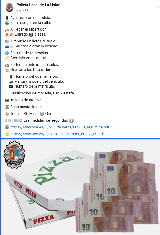 El suceso tuvo lugar ayer, cuando se efectuó un pedido a un establecimiento hostelero de La Unión para recoger en la calle. Al llegar el repartidor, los llamantes recogieron los productos y lanzaron al suelo los billetes, que resultaron ser falsos, huyendo a gran velocidad mientras eran recogidos. La Policía Local informa que los autores están identificados tanto por el número de teléfono con el que se efectuó la llamada como por el modelo y matrícula del vehículo. Se trata de un delito por uso de moneda falsa y estafa.