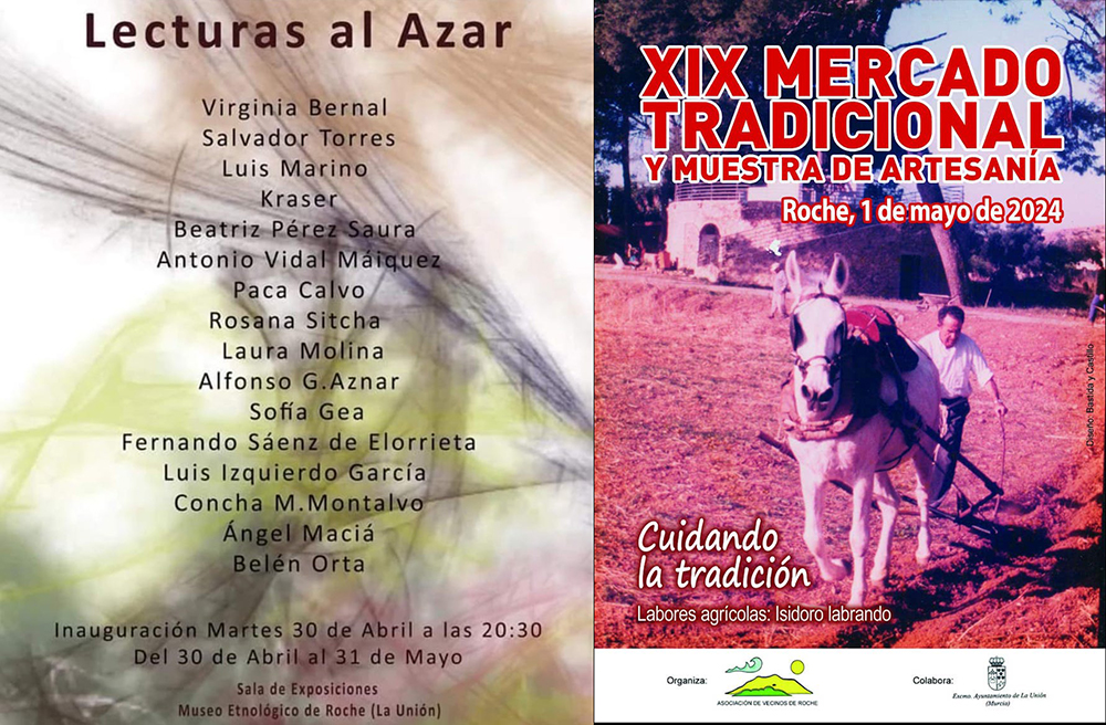 La sala de exposiciones del Museo Etnográfico acoge hoy, a las 20.30 horas, la exposición ‘Lecturas al azar’, que se mantendrán hasta el 31 de mayo. La pedanía unionense también será foco de atención este miércoles festivo con la celebración de la décimo novena edición de su mercado tradicional y muestra de artesanía desde las diez de la mañana.
