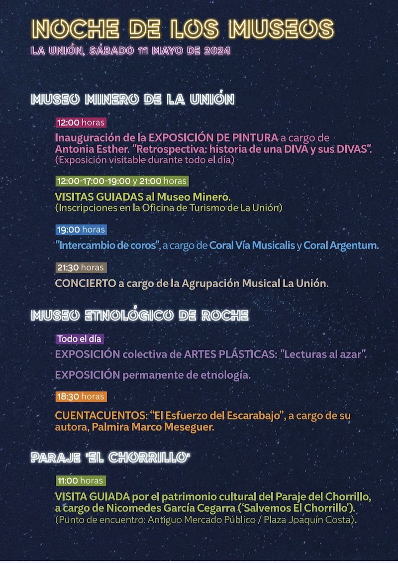 - Visitas guiadas al Museo Etnográfico de Roche durante todo el día; Exposición colectiva de Artes Plásticas ‘Lecturas al azar’; Exposición permanente de Etnología; A las 20 horas, cuentacuentos de la autora murciana Palmira, ‘El esfuerzo del escarabajo’.- Visitas al Museo Minero, durante todo el día (en horarios de 12, 17, 19 y 21 horas); A las 12 horas, inauguración de la exposición de pintura de Antonia Esther ‘Retrospectiva: historia de una Diva y sus Divas’, que se podrá visitar durante todo el día; De 19 a 20 horas, actuación de dos corales en el salón de actos del Museo, la Coral Argentum y Coral Vía Musicalis de Beniaján; A las 21:30 horas, gran concierto de la Agrupación Musical La Unión (AMLU).