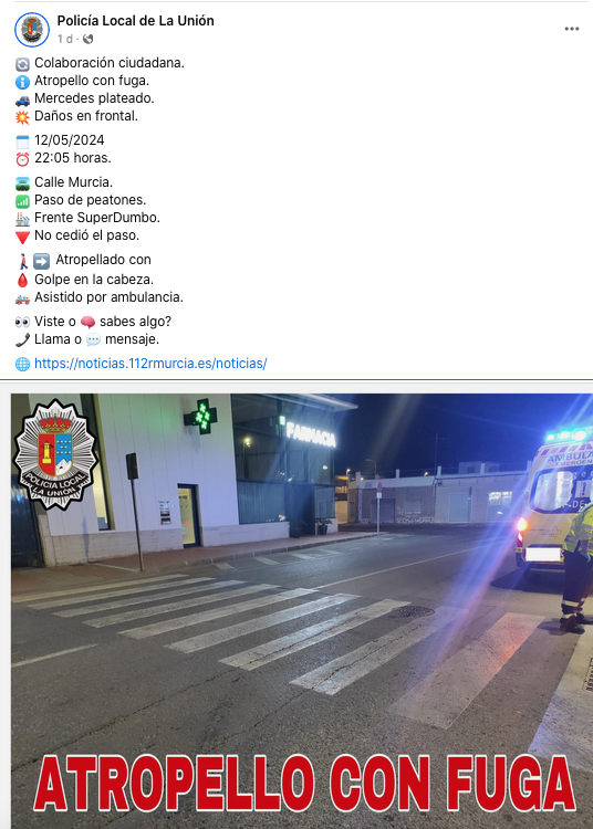 El domingo, sobre las diez de la noche, se produjo el atropello de una persona en un paso de peatones próximo a la farmacia de El Garbanzal, sufriendo la víctima un golpe en la cabeza, por el que fue asistido por una ambulancia. Lo que no sabe es quién era el conductor de Mercedes plateado del atropello. La Policía Local de La Unión pide a los ciudadanos que si saben algo de este asunto llamen o les envíen mensajes. Un dato: el turismo sufrió daños en el frontal por la colisión.