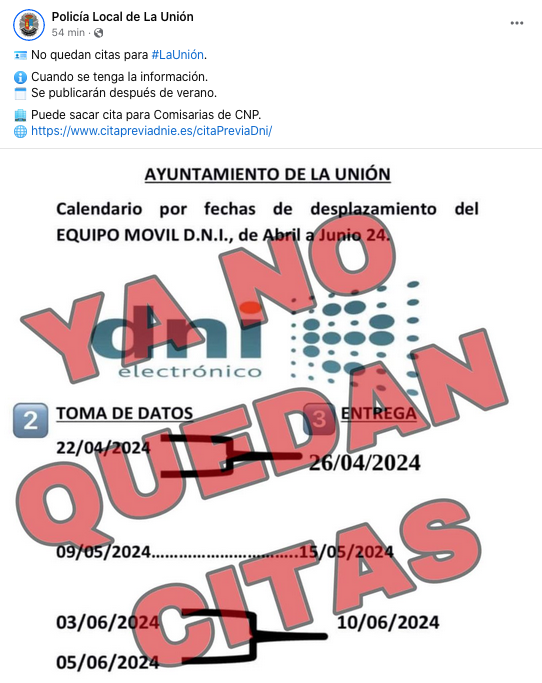 - Por otro lado, el cuerpo municipal informa que se han agotado las citas para el DNI hasta junio, inclusive