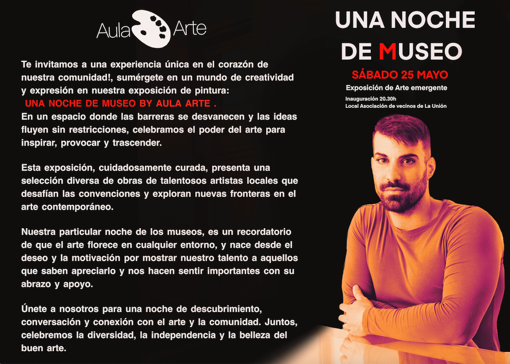 Bajo el título 'Una noche de museo', en palabras del artista, "nuestra particular noche de los museos es un recordatorio de que el arte nació libre y florece en cualquier entorno, y nuestra exposición, surge desde el deseo y la motivación por mostrar nuestro talento a aquellos que saben apreciarlo y que nos hacen sentir importantes con su apoyo". La exposición se inaugurará a las 20.30 horas y se podrá disfrutar de un tiempo de buena conversación y arte hasta las once de esa noche.