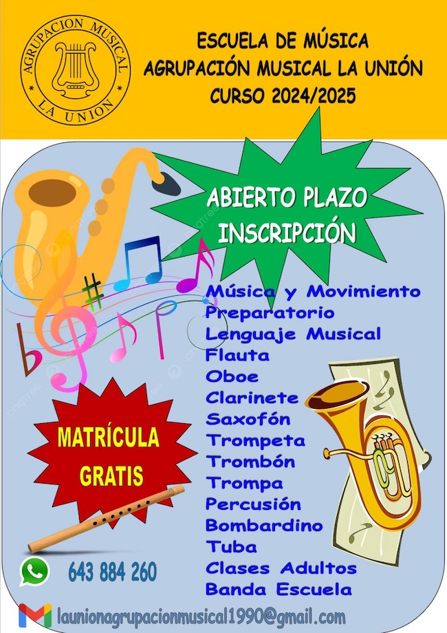 La Agrupación Musical La Unión, abre el plazo de inscripción para el próximo curso 2024/2025. Desde los 4 años y hasta los 99 podrán matricularse de forma gratuita en las diferentes opciones de instrumentos de viento (madera y metal) y percusión.