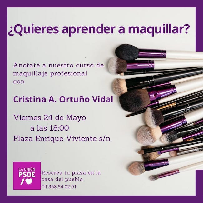 Es la actividad que PSOE de La Unión organiza esta tarde a las 18 horas en la plaza Enrique Viviente. El curso de maquillaje profesional será dirigido por Cristina A. Ortuño Vidal.