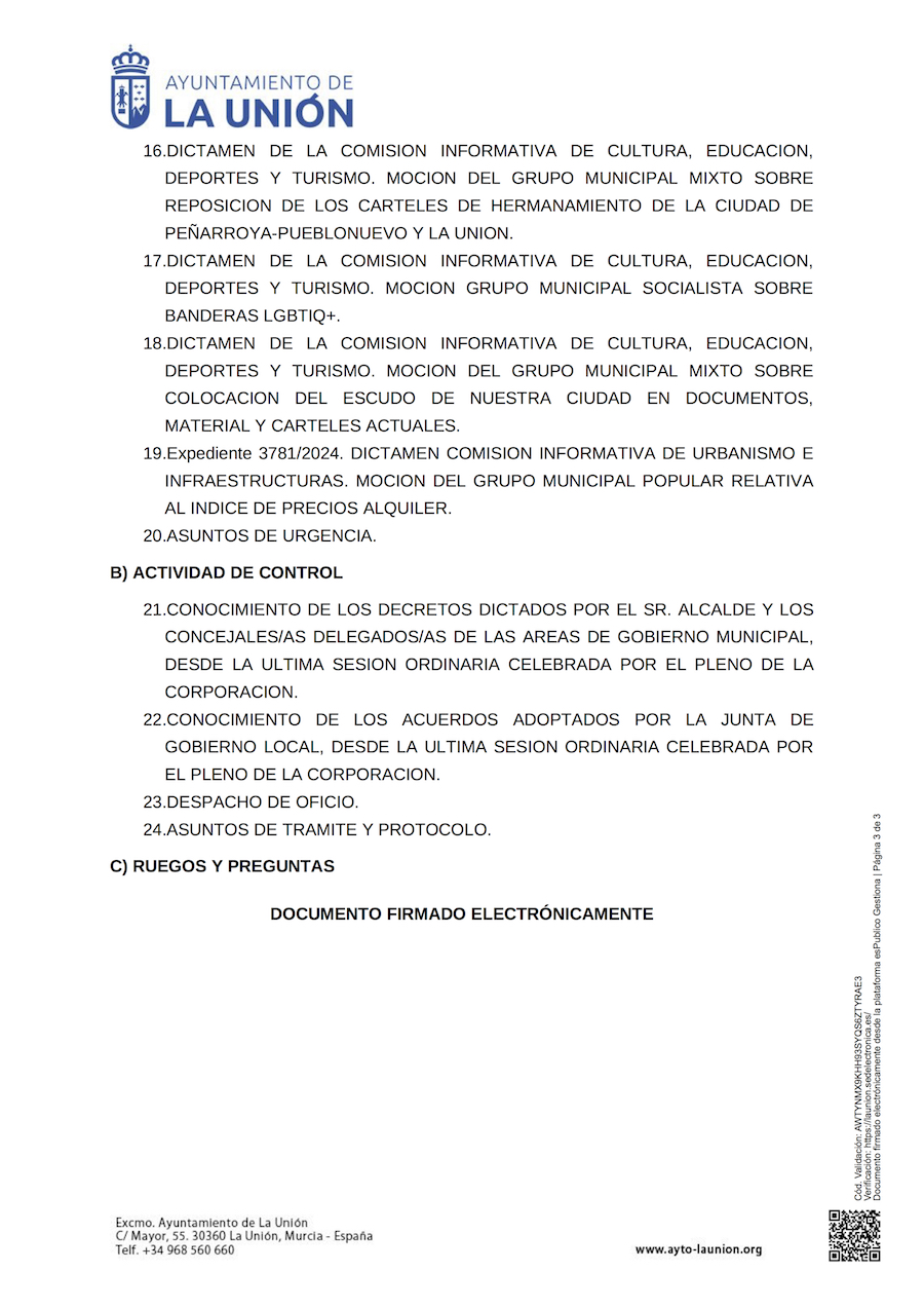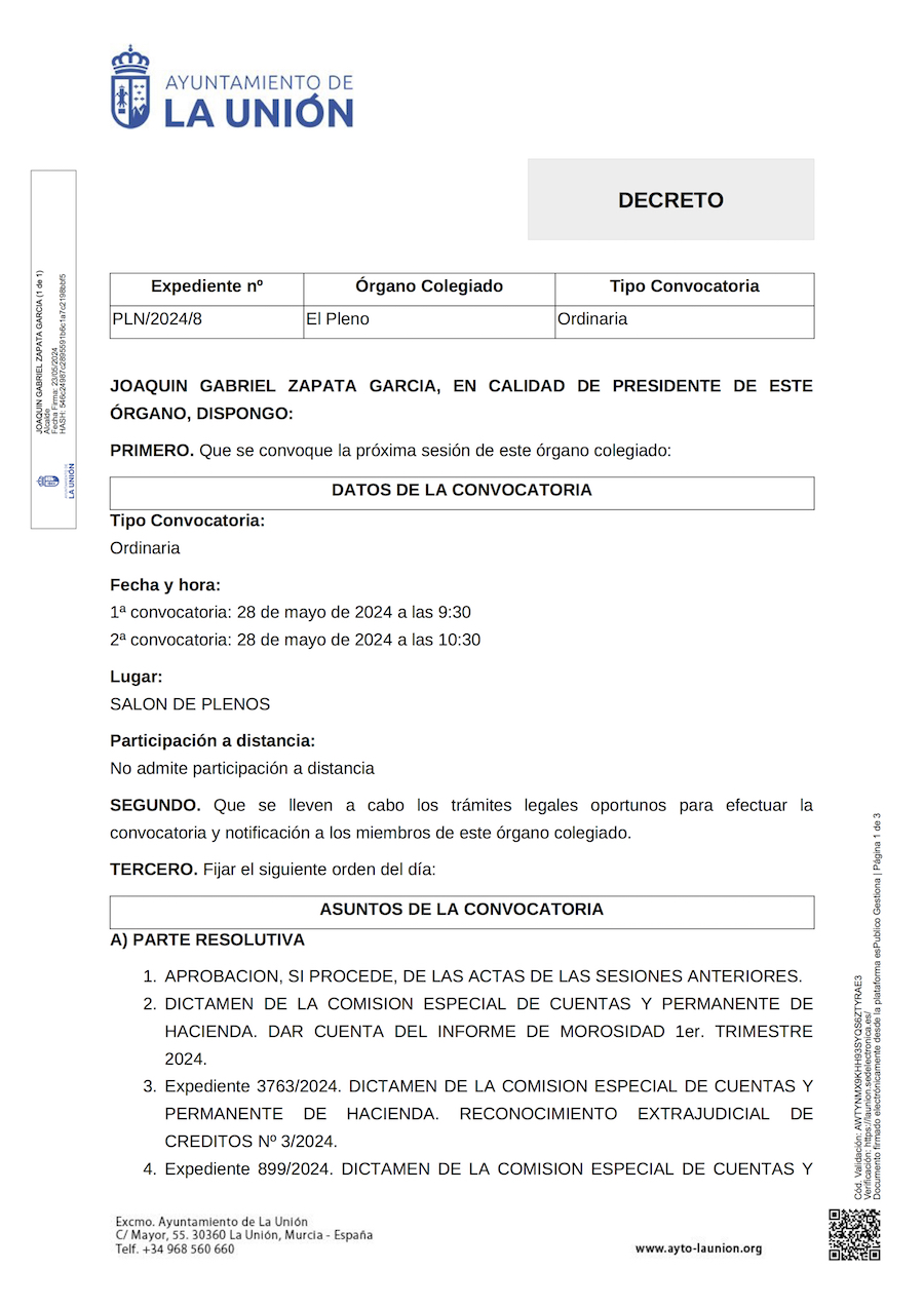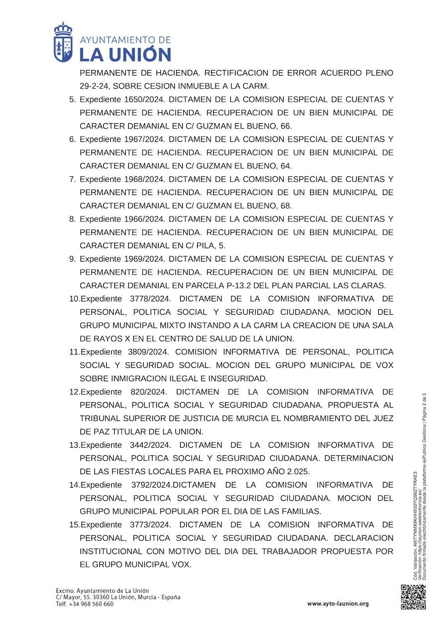 La corporación municipal celebra sesión ordinaria este 28 de mayo, a partir de las nueve y media de la mañana en primera convocatoria, en el salón de plenos del Ayuntamiento de La Unión, con 24 puntos en el orden del día, además de ruegos y preguntas. Hay asuntos económicos, cesión de inmueble, recuperación de bienes municipales, la petición de que el centro de salud tenga sala de Rayos X, temas de inmigración y seguridad ciudadana, nombramiento de juez de paz, fijar las fiestas locales para 2025, reposición de lso carteles del hermanamiento con la ciudad de Peñarroya, petición de instalar banderas LGBTIQ+, etc.