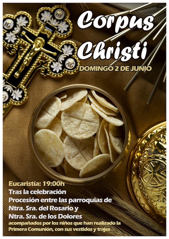 Este domingo tendrán lugar la eucaristías en las iglesias de Nuestra Señora del Rosario y de Nuestra Señora de los Dolores, a partir de las siete de la tarde. A su conclusión comenzará la procesión con los niños que este año ha efectuado su primera comunicación, estando jalonado el recorrido con algunas altares.