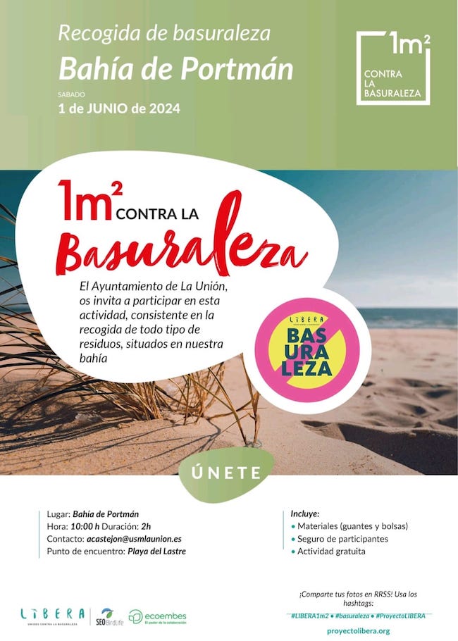 Colectivos ecologistas y el Ayuntamiento de La Unión organizan este sábado una actuación de recogida de basura en la playa de El Lastre a partir de las diez de la mañana. Actividad gratuita para los participantes, quienes serán asegurados.