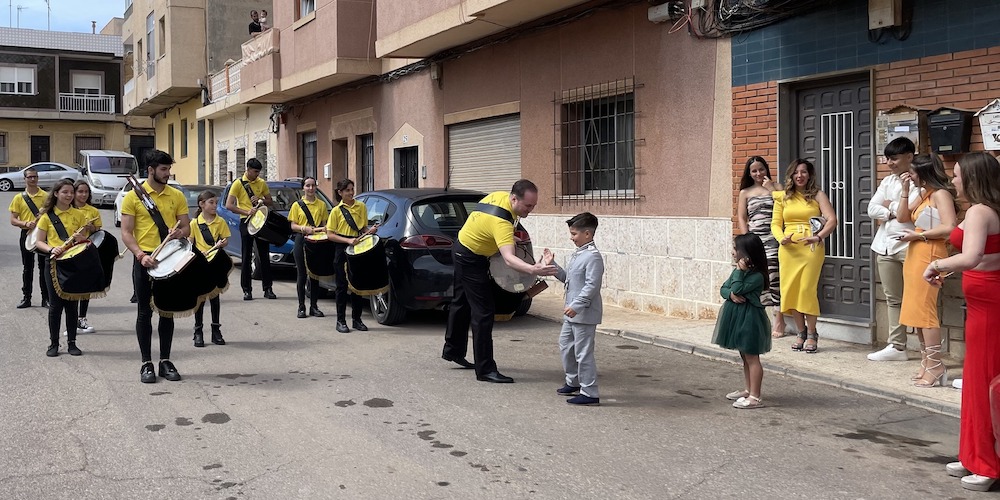 Esa bonita mañana de domingo, mientras el pequeño timbalero e intégrate de esta banda Virgen de la Caridad, Alejandro Fernández se realizaba las últimas fotos con sus familiares más cercanos, frente al parque de su casa antes de dirigirse hasta la iglesia del Rosario, para hacer la primera comunión. Varias calles atrás, tambores comenzaron a sonar, levantando expectación entre vecinos, todos los allí presentes, y especialmente en el joven integrante de esta banda y protagonista de ese día, Alejandro, que con gran alegría, ilusión y emoción, vio aparecer aproximándose hasta a él, a un grupo de integrantes de su banda con el fin de darle una bonita sorpresa, en este importante día para él.