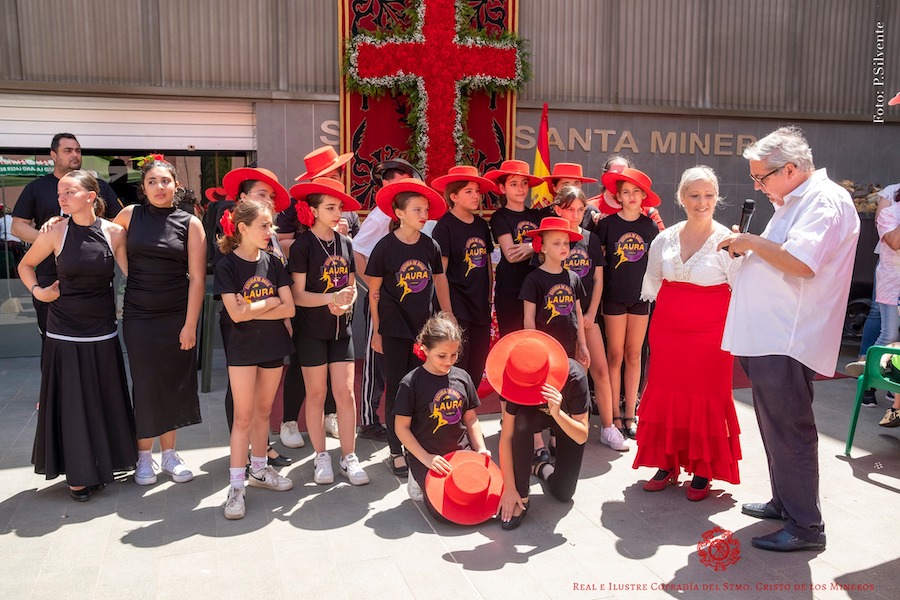 La foto adjunta muestra a Laura Tardido y alumnos tras la exhibición efectuada en las 'Cruces de mayo de la Sierra Minera' junto al Museo de Semana Santa.