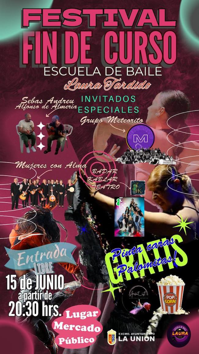 La academia de Laura Tardido celebrará su fin de curso el 15 de junio, sábado, en el Mercado Antiguo de La Unión a partir de las ocho y media de la tarde-noche. La gala también contará con la participación del grupo 'Meteorito', de las voces de 'Mujeres con alma', de la compañía teatral 'BadarKablar Teatro' y de los flamencos Sebas andreu y Alfonso de Almería, entre otros alicientes paralelos.