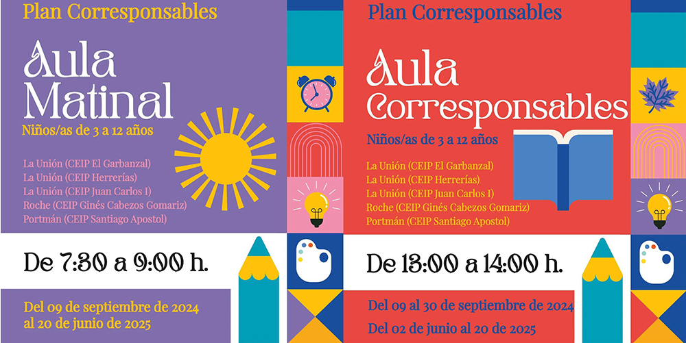 El Ayuntamiento de La Unión ha dado a conocer las opciones que tienen las familias con las nuevas iniciativas que se introducen y los centros donde se desarrollarán. Habrá aula matinal, aula corresponsables y aula vespertina para niños de 3 a 12 años de edad, además de la escuela de verano con 237 plazas.