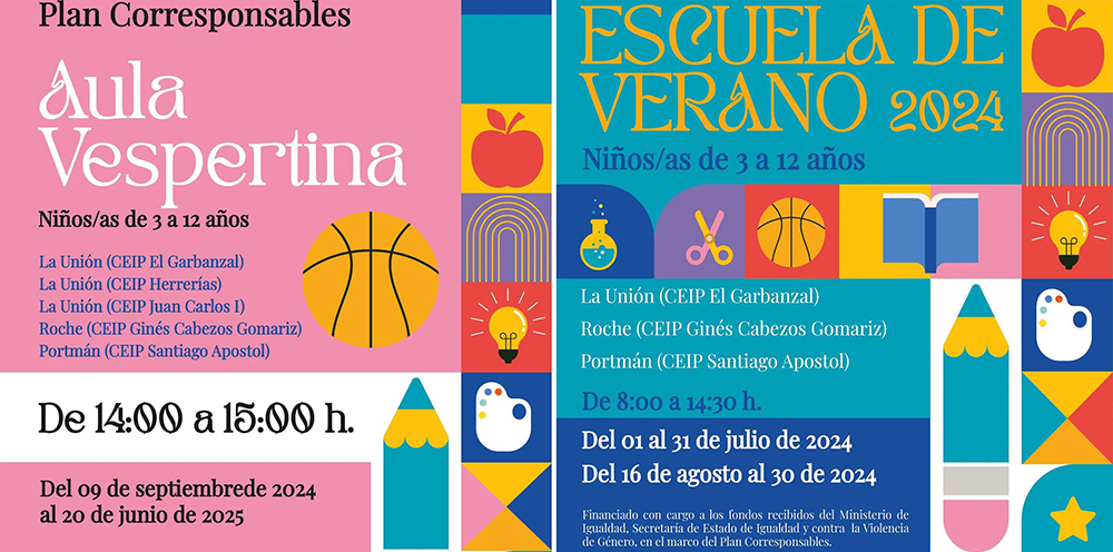 4. ESCUELA DE VERANO: La escuela de verano es otra de las actividades clave del plan. Se llevará a cabo en el CEIP El Garbanzal en La Unión, CEIP Ginés Cabezos Gomariz en Roche y CEIP Santiago Apóstol en Portman. Estará operativa de 8:00 a 14:30 horas, del 1 al 31 de julio de 2024 y del 16 al 30 de agosto de 2024. Además, se ha ofrecido la ampliación de horario, con 60 plazas para La Unión y 20 plazas para cada pedanía. Una ampliación de 30 minutos antes y 30 minutos después del horario establecido. Esta iniciativa proporcionará un entorno seguro y divertido para 237 niños y niñas durante las vacaciones de verano, con una amplia gama de talleres y actividades recreativas.