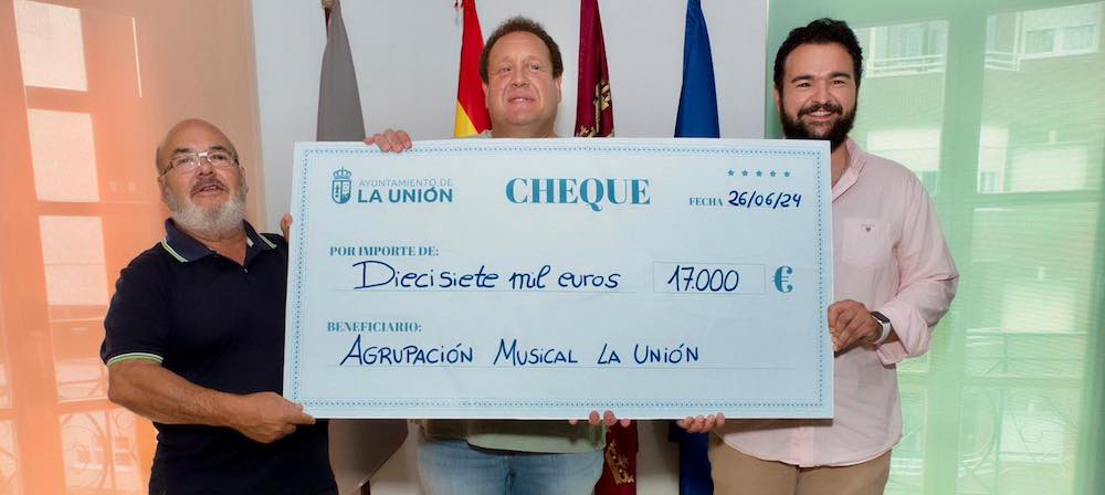 El alcalde ha hecho entrega de una subvención de 17.000 euros a la Agrupación Musical La Unión para la realización de sus actividades, que incluyen actuaciones para la promoción de la cultura musical, educación musical profesionalizada a nivel pedagógico, inversiones en material para los educandos, inversiones para el desarrollo y evolución de la banda de la AMLU.