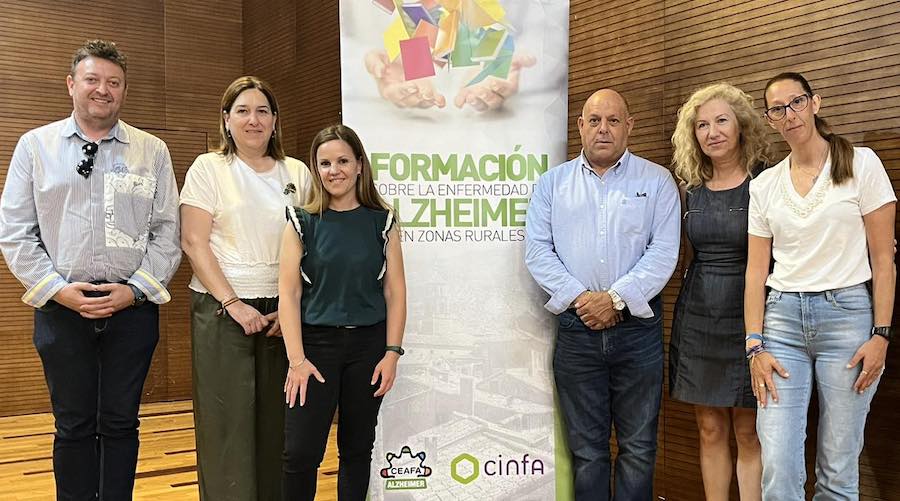 Los concejales de Personal y Política Social, Dami García, de Infraestructuras, Fran García, de Festejos, Loly Mendoza y de Salud, Damián García, del equipo de gobierno municipal, acompañados por la responsable de Servicios Sociales del consistoiro, Cati López, asistieron a la formación 'La enfermedad de Alzheimer en zonas rurales", organizada por la Confederación Española de Alzheimer (CEAFA) y la Federación de Asociaciones de Familiares de Alzheimer de la Región de Murcia (FFEDARM), en colaboración con el Ayuntamiento.