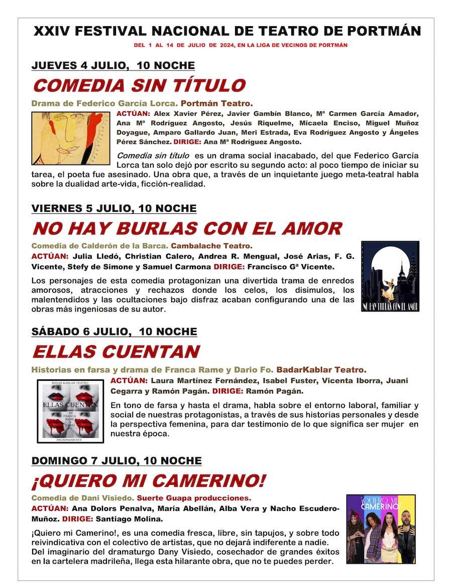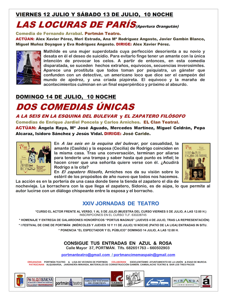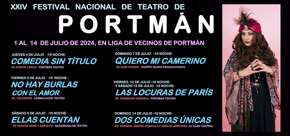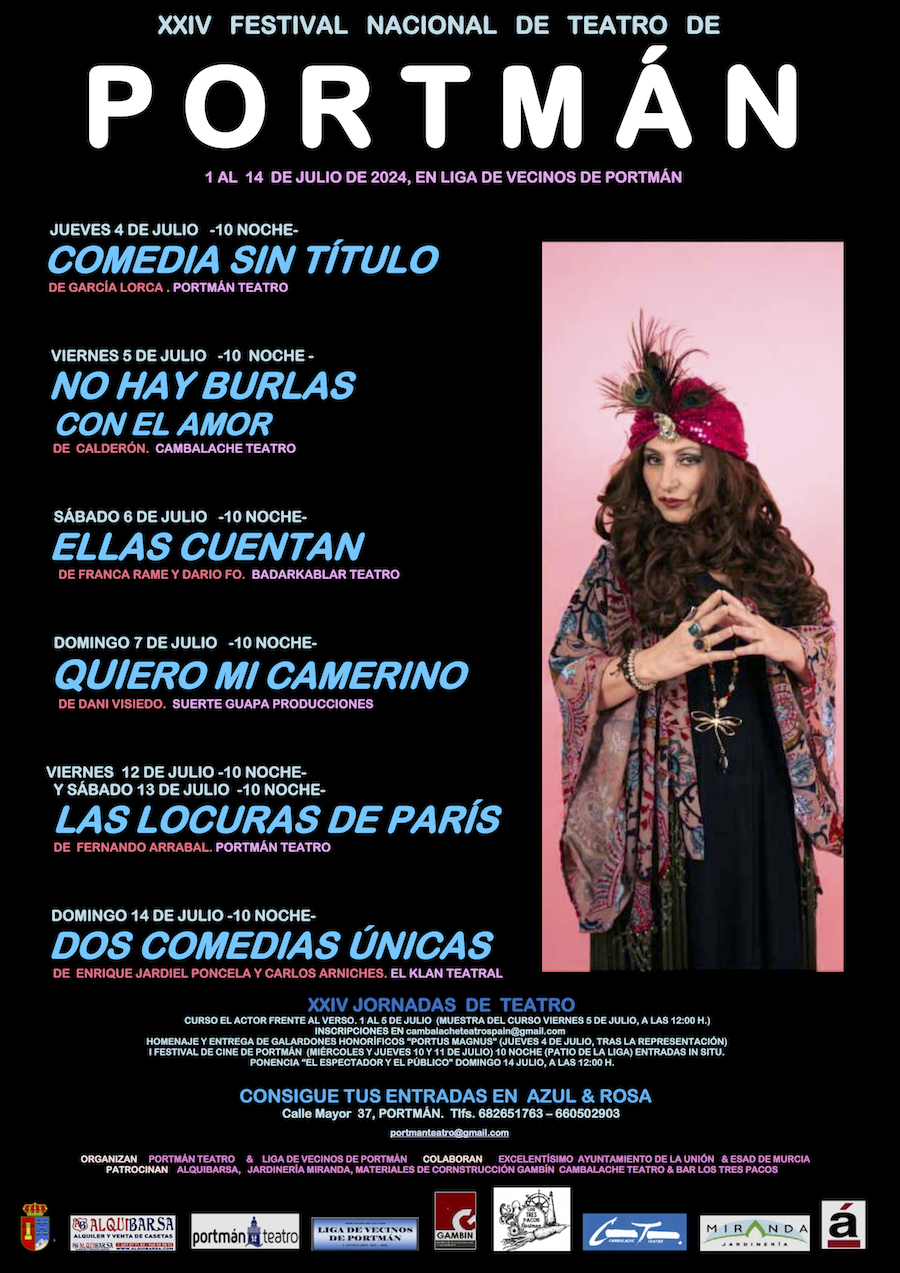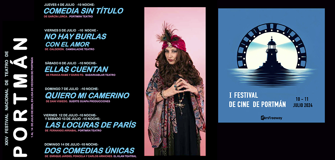 También estarán las compañías 'Cambalache Teatro', 'BadarKablar Teatro', 'Suerte Guapa Producciones' y 'El clan Teruel', que cerrará con 'Dos comedias únicas' el 14 de julio. También habrá curso de 'El actor frente al verso', conferencia, entrega el galardón 'Portus Magnus' y se estrena un festival cinematográfico durante dos jornadas, siendo organizado por la nueva asociación cultural local 'Portmán Cinema'.