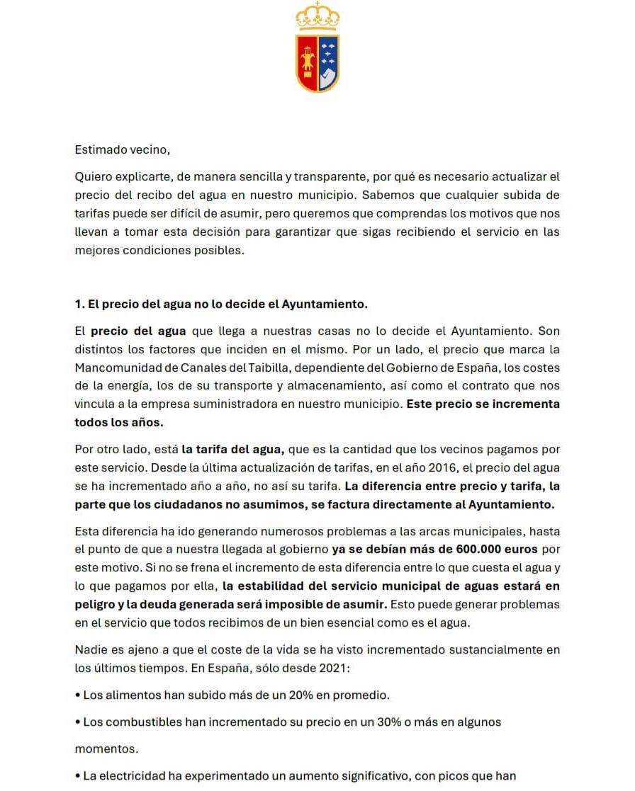 El primer edil de La Unión, Joaquín Zapata, difunde un escrito dirigido a los vecinos del municipio en el que expone los argumentos que llevan a su formación a actualizar la tarifa: "La estabilidad del servicio municipal de aguas estará en peligro y la deuda generada será imposible de asumir", afirma, indicando que el aumento por "el incremento de la tarifa del agua y alcantarilla, impuestos incluidos, será de entre 3 y 6 euros al mes".