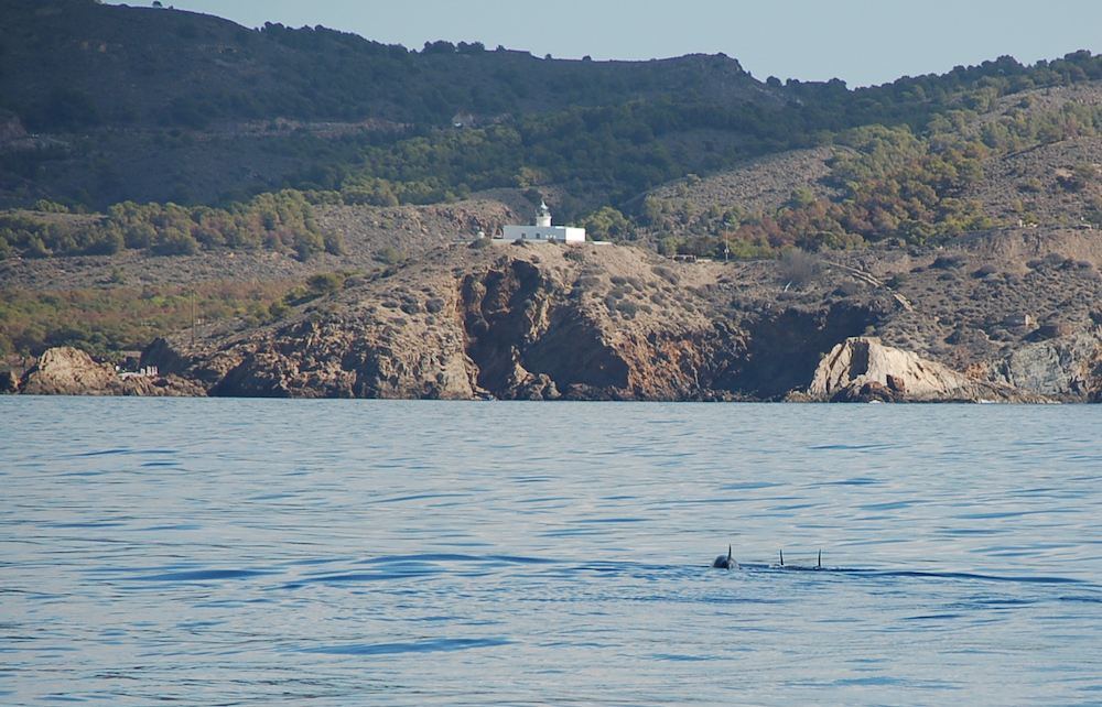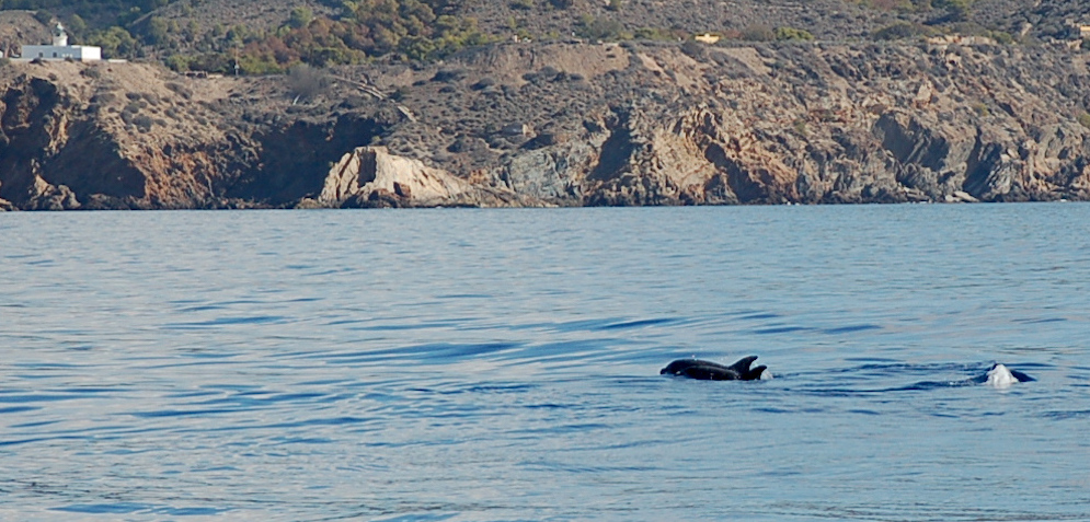La toma de fotografías al velero 'Diosa Maat' de Ecologistas en Acción, en su acción reivindicativa de esta mañana, ha coincidido con la presencia de dos mamíferos cetáceos cerca de la costa de Portmán.