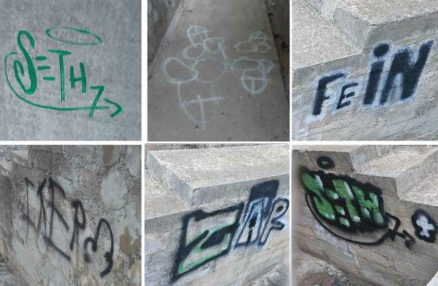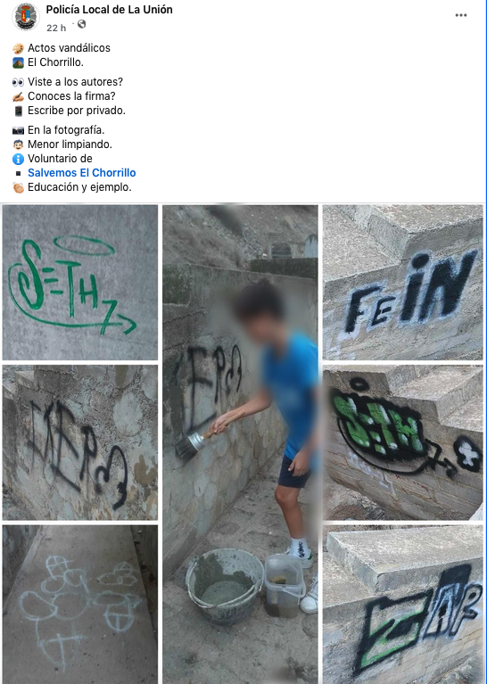 Los 'grafiteros vándalos' suelen dañar espacios públicos pintando su firma o un dibujo que identifica a unos con respecto a otros. ¿Sabes quiénes están detrás de estas pintadas efectuadas en el paraje de El Chorrillo? La Policía Local de La Unión pide los vecinos que colaboren en su identificación aportando datos a través del canal privado de su perfil de Facebook.