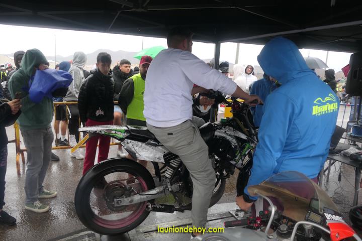 El motoalmuerzo organizado por el Motoclub de La Unión se vio muy afectado por una mañana de domingo en la que no dejó de llover, pero, aún así, fueron varios cientos de personas los que acudieron y los organizadores se esforzaron en sacar adelante lo máximo posible del programa preparado. En la foto, el banco de potencia estrenado en esta edición.