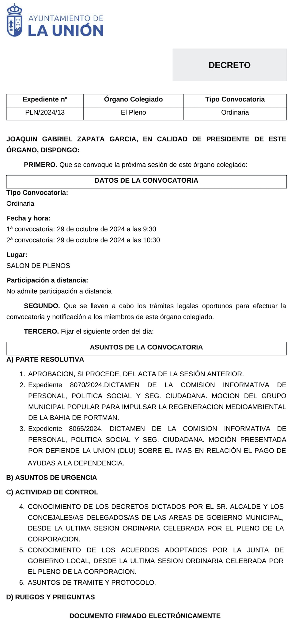 Martes de pleno en La Unión