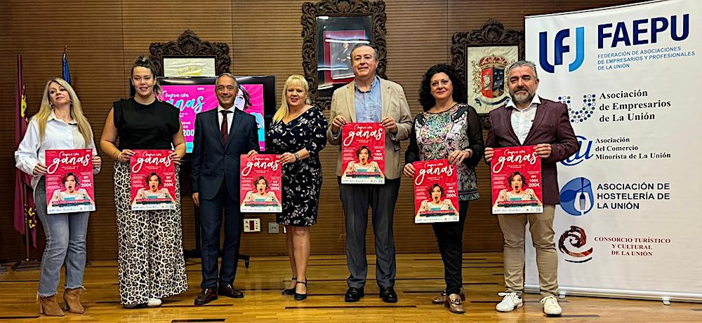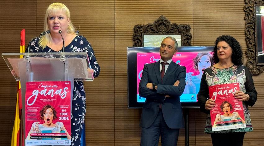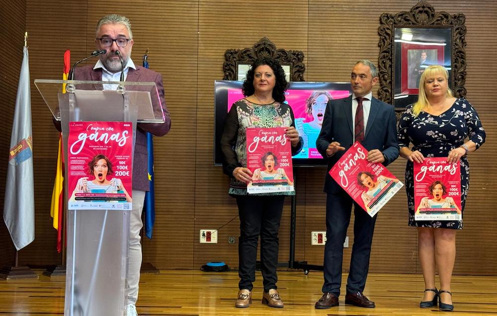 La concejal de Hacienda y Economía, Tere López, la concejal de Comercio, Laura Giménez, el presidente de FAEPU, Carlos Bernabé, el director general de Impulso al Comercio, Rafa Gómez y el presidente de la Asociación de Comercios de La Unión, Estani Martínez, han presentado hoy la campaña ‘Compra con ganas’ que tendrá lugar hasta el 30 de noviembre en los comercios de la ciudad. La campaña está organizada por FAEPU, con la colaboración del Ayuntamiento y la Comunidad Autónoma.