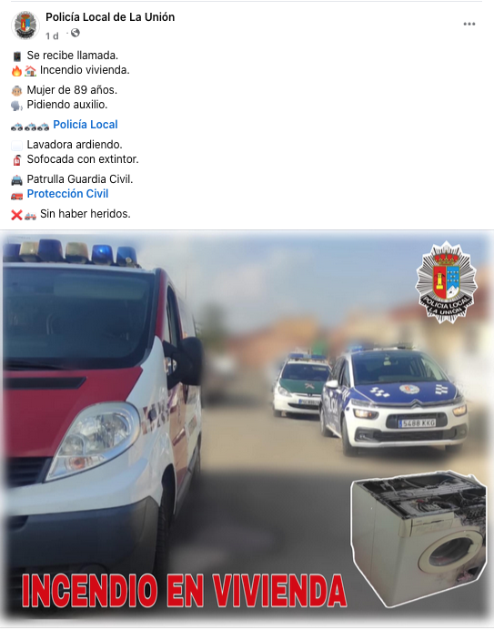 La Policía Local acudió al incendio de una lavadora en el interior de una vivienda, en la que se encontraba una mujer de 89 años de edad pidiendo auxilio, sofocando el fuego con un extintor. Otro se utilizó en una primera actuación hacia un vehículo que ardió, al parecer por un cortocircuito, terminando de extinguir el incendio los bomberos.