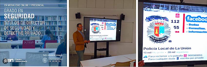 Juan Luis Segado, agente de la Policía Local de La Unión y administrador del perfil en Facebook del cuerpo, ha acudido hoy a las aulas de ISEN Formación, sede en Cartagena de la Universidad de Murcia, donde ha hablado a los alumnos del grado de Seguridad del trabajo policial y de la gestión de las redes sociales.