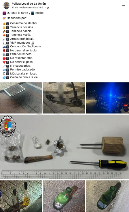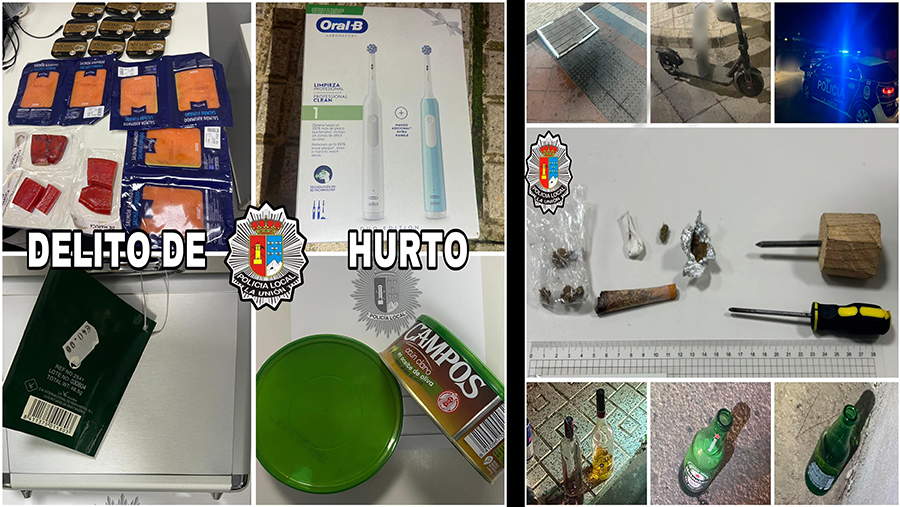 Agentes de la Policía Local dieron alcance al autor de varios hurtos en establecimientos de La Union, quien llevaba encima los objetos sustraídos. Por otro lado, el cuerpo municipal efectuaron durante una tarde-noche del pasado fin de semana un total de 24 denuncias, por conceptos que iban desde tenencia de drogas y armas hasta conducción negligente, no respetar señales de tráfico o ir dos personas sobre un patinete, entre otros.