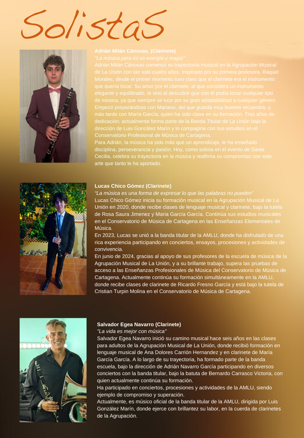 El próximo sábado 23 de noviembre, a las 18 horas, tendrá lugar el tradicional concierto en honor a Santa Cecilia en el que cuatro nuevos músicos se incorporaran a nuestra banda titular: Irene Díaz López en la especialidad de clarinete, Leo Agūera Iniesta y Hugo Alcaraz Saura en la de Saxofón y José Ángel Guerrero Esteban en la de Trombón.