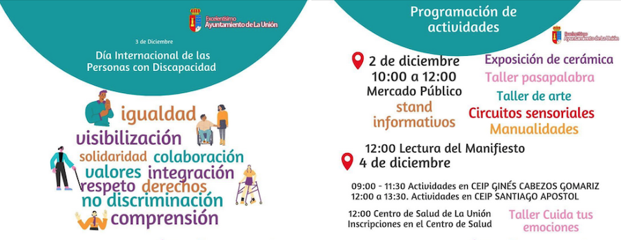 El ayuntamiento de la Unión, con motivo de la jornada que tiene lugar el 3 de diciembre, ha preparado un programa para su celebración, en el que este lunes el epicentro será el Mercado Público, mientras que el miércoles se desplaza por los colegios de Roche y de Portmán, además del centro de salud de la ciudad.