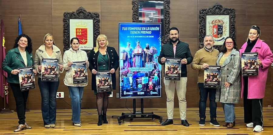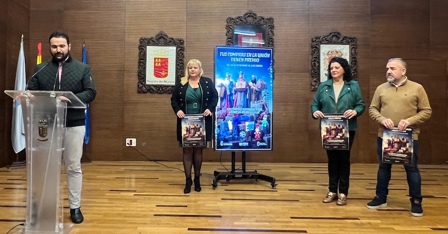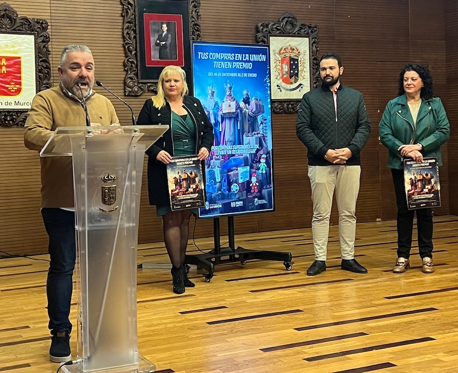 El alcalde ha presentado hoy la campaña ‘Tus compras en La Unión tienen premio’ junto a la concejal de Economía y Hacienda, Tere López, la concejal de Comercio, Laura Giménez y el presidente de la Asociación de Comercios de La Unión, Estanis Martínez.