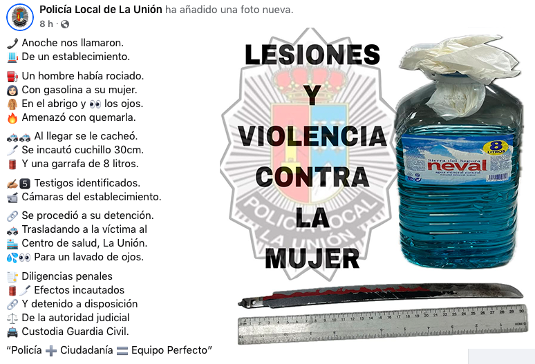 La Policía Local de La Unión llevó a cabo anoche el arresto de un hombre que echó el combustible con una garrafa sobre el abrigo y los ojos, además de amenazar con quemarla. Había varios testigos del suceso. La víctima fue llevada al centro de salud.