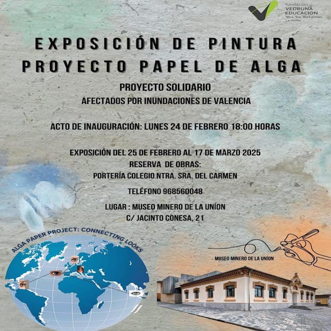 La Fundación Vedruna Educación y el Museo Minero de La Unión llevarán a cabo en la tarde de este inminente lunes la inauguración de la exposición de pintura 'Proyecto papel de alga', un proyecto que tiene como finalidad ayudar a los afectados por las inundaciones que tuvieron lugar el pasado año en Valencia.