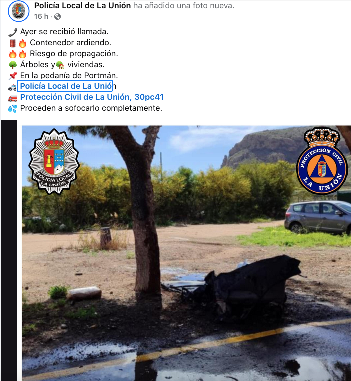 Durante la ventosa jornada de ayer se registró el incendio de un receptor de basura en Portmán. Fue sofocado con rapidez, evitándose que las llamas alcanzasen arbolado y viviendas próximas.