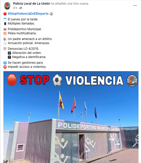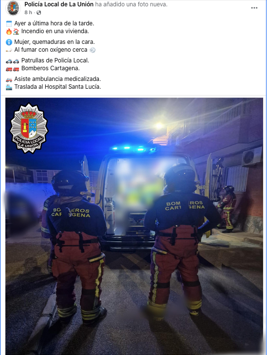 La Policía Local informa que anoche se produjo el incendio en una vivienda de La Unión y que una mujer fue trasladada al hospital con quemaduras en la cara al fumar con oxígeno cerca. Por otro lado, el jueves hubo una tángana en el polideportivo, donde un padre amenazó a un árbitro. Ha sido denunciado y se gestiona que se le impida el acceso a recintos deportivos.