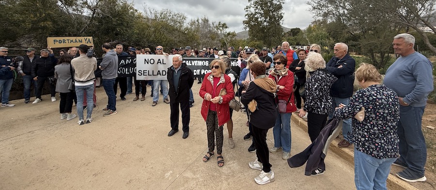 Residentes del pueblo de Portmán han estado esta mañaña junto al laboratorio para que los representantes del gobierno de España pudieran ver sus pancartas oponiéndose al sellado, incluida una viñeta de gran tamaño creada por el dibujante José Manuel Puebla con el texto 'Sellar no es regenerar'. La oposición a la solución aportada por el Estado es absoluta.