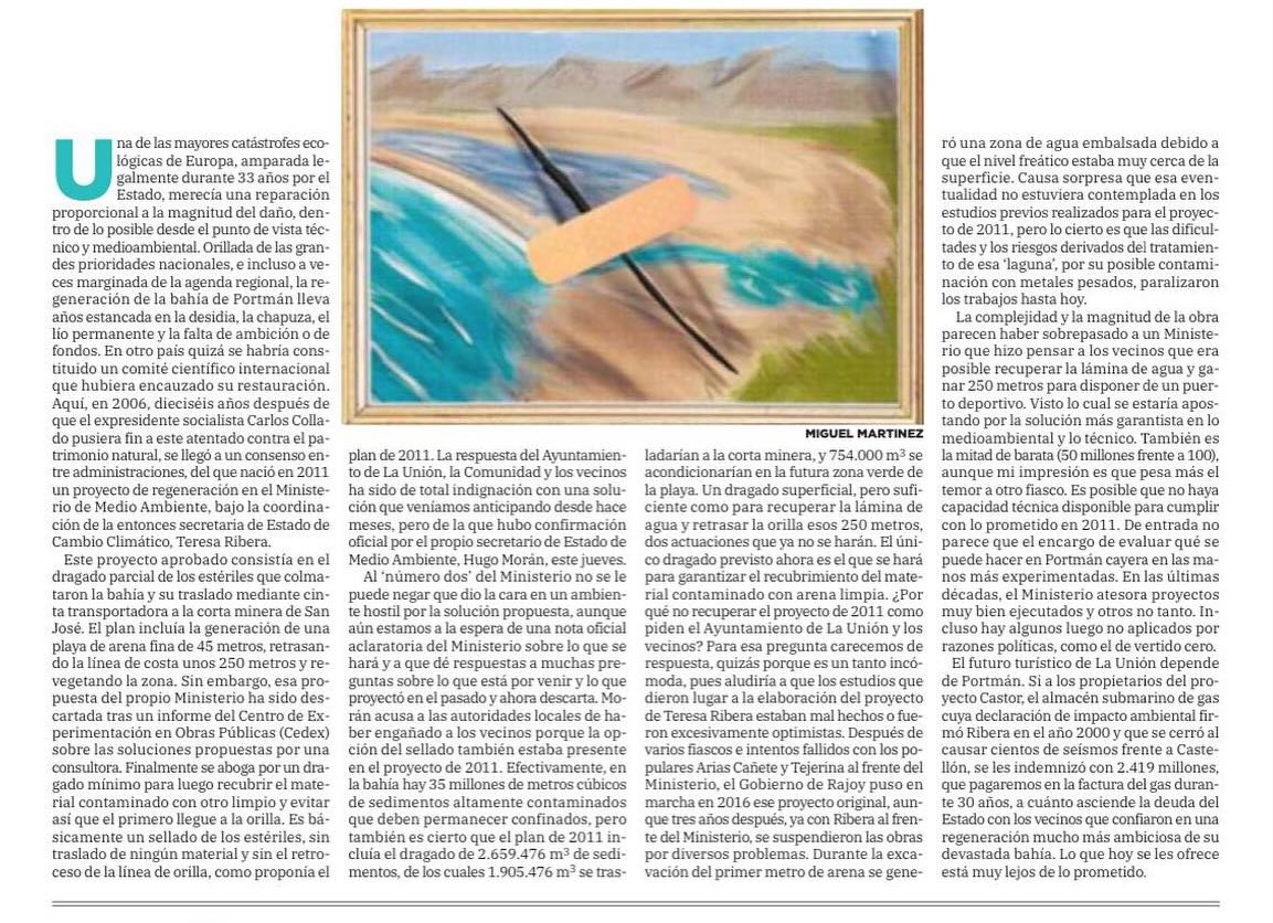 Reproducimos el artículo de opinión escrito por Alberto Aguirre de Cárcer, director del periódico La Verdad, sobre la situación actual de la bahía de Portmán