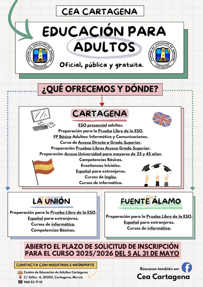 Centro de Educación de Adultos (CEA) comunica la apertura del plazo para matricularse del curso 2025/26 que organizará en sus tres sedes de la comarca, ubicadas en Cartagena, La Unión y Fuente Álamo. El período será desde el primer lunes del próximo mes hasta el 31.