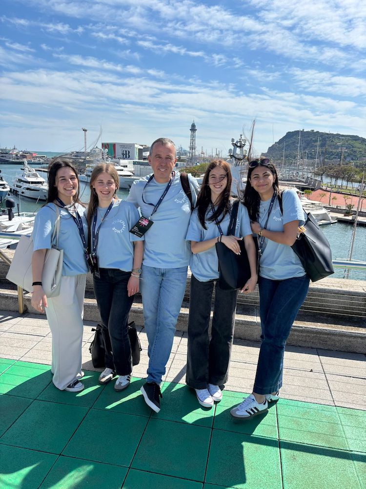 Imagen de Irene García Hernández, María Egido Gambín, Mercedes Cataño Sánchez y Lucía Fernández Larios, alumnas de Vedruna Carmelintas, con el profesor tutor, Ginés Caparrós Conesa, en Barcelona, donde se encuentran para presentar su innovador proyecto con hogas elaboradas con algas en el concurso 'The Challenge' de Fundación LaCaixa.