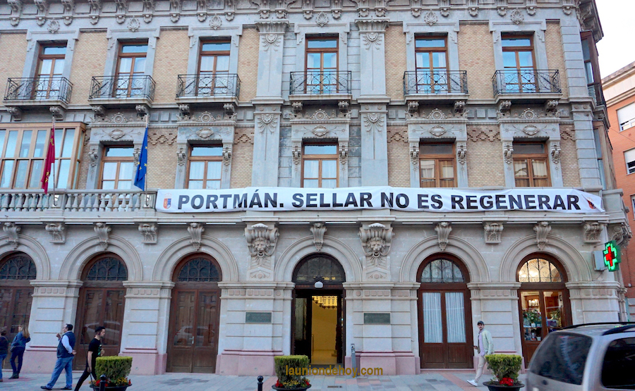 La fachada del Ayuntamiento de La Unión luce desde este reciente fin de semana una gran pancarta donde se muestra la postura firme de oposición al sellado de la bahía de Portmán y la exigencia de que se lleve a cabo la regeneración que se comenzó a prometer hace más de siete lustros.