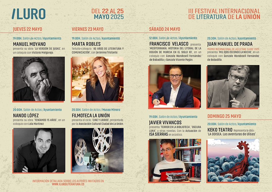 El III Festival Internacional de Literatura ILURO se desarrollará principalmente en el Salón de Actos del Ayuntamiento de La Unión y en el Museo Minero, entre los días 22 y 25 de mayo. La programación incluye la presentación de obras como La versión de Judas de Manuel Moyano, Teníamos 15 años de Nando López y Mediterranía de Francisco Velasco, así como una tertulia sobre comunicación y literatura con Marta Robles y Jerónimo Tristante. Además, habrá un ciclo de cine bajo el título Cine y libros, organizado por la Filmoteca La Unión, y la representación teatral La Odisea a cargo de Keko Teatro. Como colofón, Juan Manuel de Prada recibirá el Premio Internacional de las Letras ILURO 2025.
