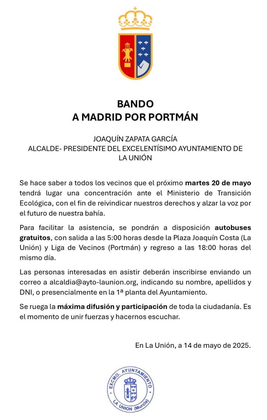 El alcalde ha emitido el bando con el que hace saber a los vecinos del municipio de la concentración ante el ministerio de Transición Ecológica del próximo martes, invitando a acudir al mayor número posible de unionense dada la importancia de lo que se reivindica. Para tal fin, el consistorio habilitará los autocares necesarios para el desplazamiento, sin coste para los pasajeros.