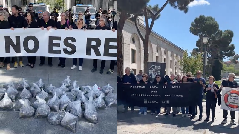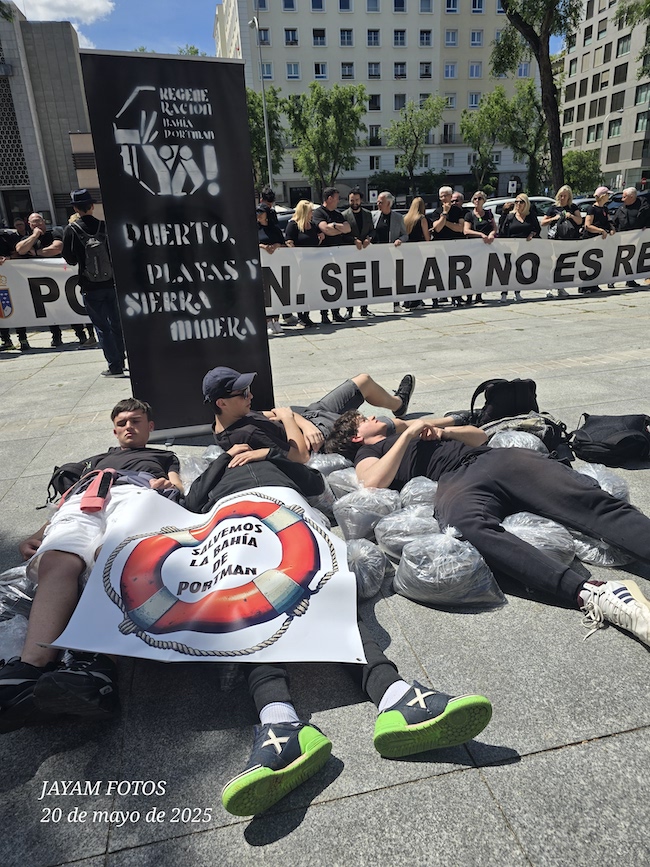 Sobre las doce horas de este martes, nada más llegar a la capital de España, los vecinos del municipio de La Unión y representantes de asociaciones que han partido en autocares a las cinco de la mañana se han presentado ante la sede del Ministerio para la Transición Ecológica y el Reto Demográfico (Miteco), sumándose entonces el senador unionense Francisco Bernabé junto a Miriam Guardiola, José Ramón Díez de Revenga y Antonia López, también miembros de la Cámara Alta. También se ha incorporado el periodista Juan Ramón Lucas. Se ha depositado en el suelo 35 bolsas con estériles recogidos en la bahía (con perfomance incluida), para enseguida desplegar la gran pancarta con la leyenda: 'Portmán. Sellar no es regenerar'. La mayoría de presentes lucía vestuario negro, de luto, pues como rezaba otra pancarta de menor tamaño: 'Pormán está de lluto por incumplimientos políticos. ¡Basta ya!'. Otra, con un dibujo de un salvavidas, también pide: 'Salvemos la bahía de Portmán'. Los pitos y el cántico '¡No al sellado!' no han dejado de sonar para llamar la atención de los viandantes y de los representantes del ministerio. También resaltar que no se ha visto distintivo de partido político alguno, pues se ha tratado de mostrar esta lucha como vecinal por encima de intereses partidistas.