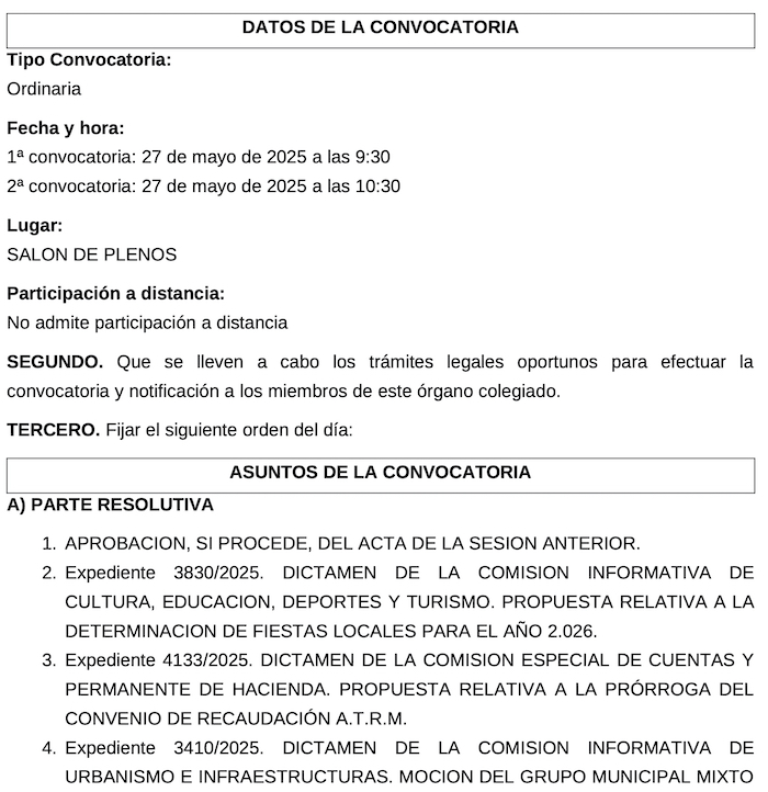 La corporación municipal celebra este 27 de mayo la sesión ordinaria de mayo con primera convocatoria a las 9.30 horas. Hay un amplio orden del día, en el que figura la designación de las fiestas locales de 2026.