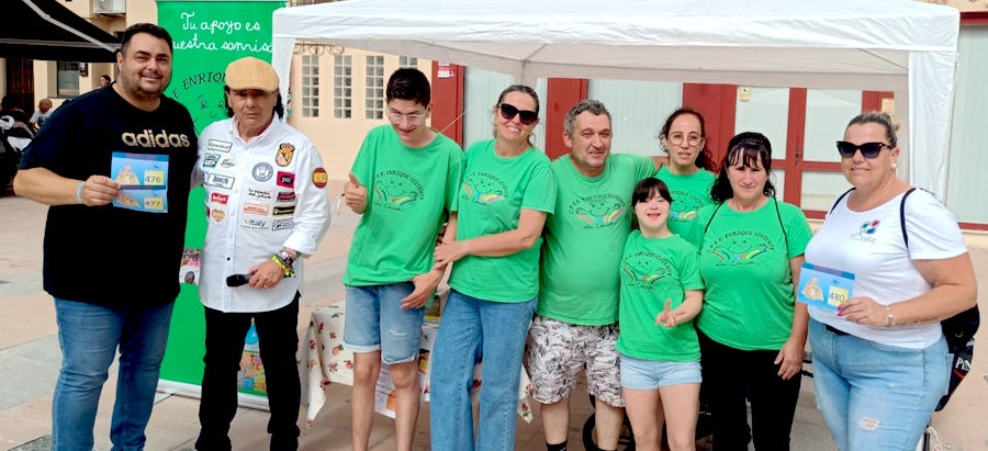 El concejal Daniel Cano (DLU) y su esposa, tras recoger sus dorsales, posan con usuarios y familiares del Enrique Viviente y con el 'speaker' de carreras deportivas Gaspar Zamora