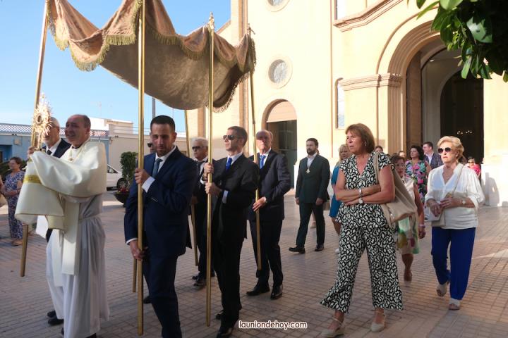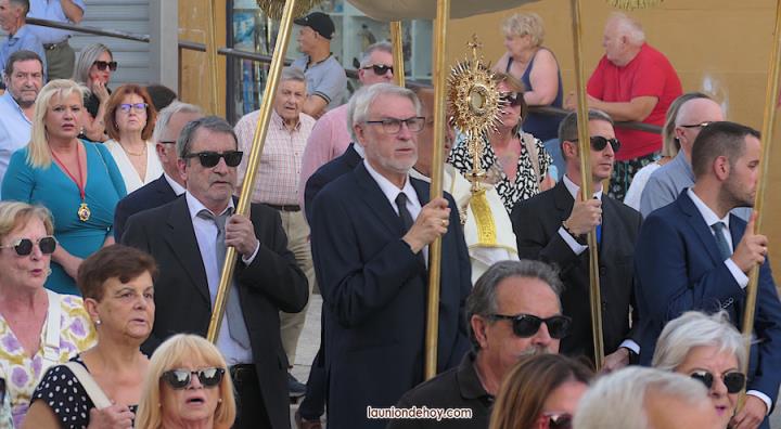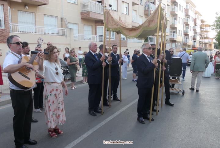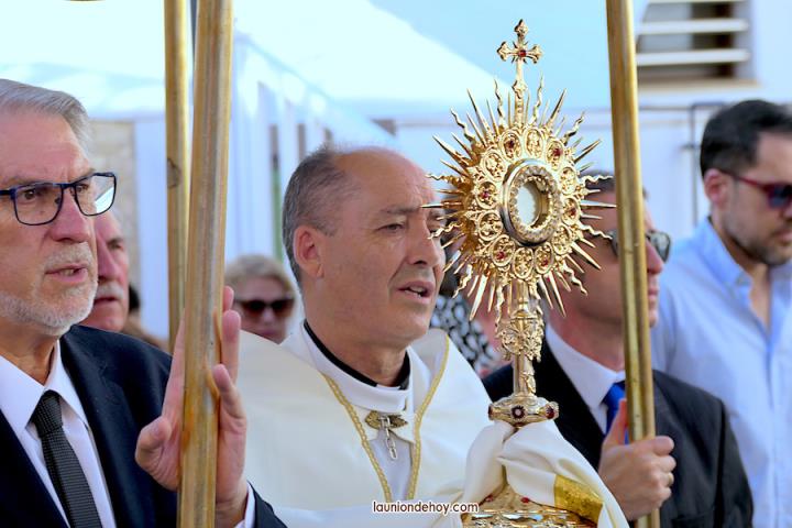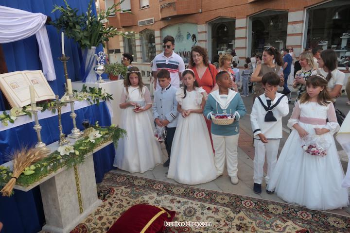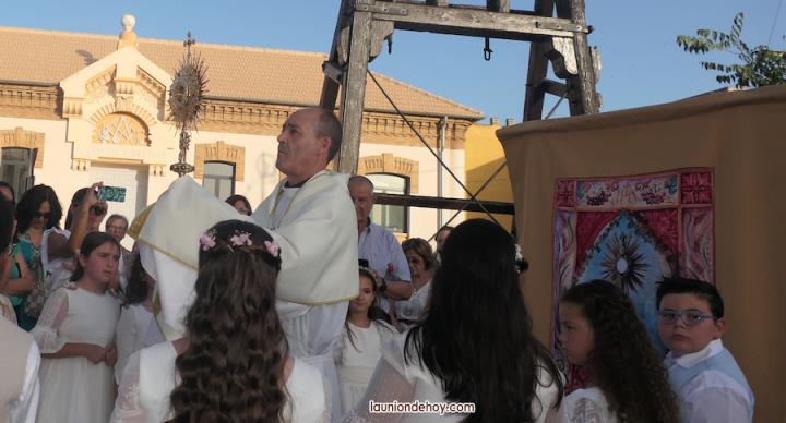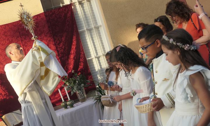 En cada uno de ellos, el reverendo Ginés Luis Vicente ha llevado 'la custodia', avanzando entre pétalos que lanzaban los niños de la primera comunión, para después pronunciar a través de la megafonía textos del libro de 'Las adoraciones al Señor'. Destacar que la música cantada ha acompañado la marcha, de cuyo buen desarrollo se han encargado efectivos de Policía Local y de Protección Civil.