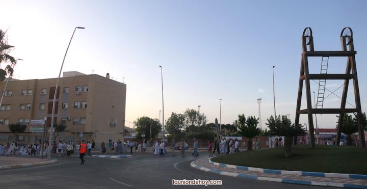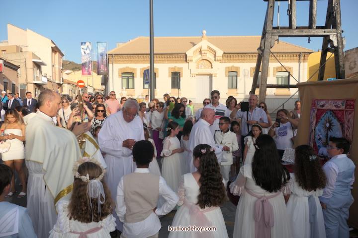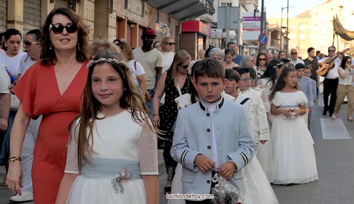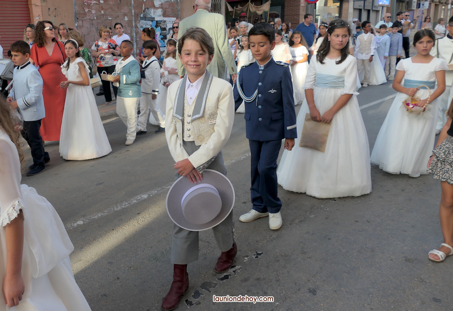 A las ocho menos cuarto se ha puesto en marcha la comida, con la cruz como estandarte y en dos filas los 28 niños (con mayoría femenina) que este año han tomado por vez primera la comunión, que lucían muy diferentes estilos de vestuarios, todos muy atractivos, siendo uno de los más singulares el de torero que ha lucido Agustín Solano, hijo del rejoneador del mismo nombre.