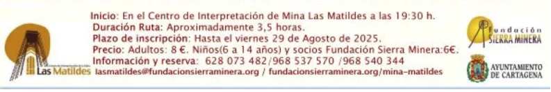 Es como Fundación Sierra Minera ha titulado la ruta nocturna minero-ambiental que, por un espacio de tiempo de unas tres horas y media, llevará a cabo el últimos sábado de este mes, con recorrido que pasará por las minas ‘Segunda primavera’ y ‘Blanca’, con salida y regreso a ‘Las matildes’. Precio de 8 euros para adultos y de 6 para niños y asociados.
