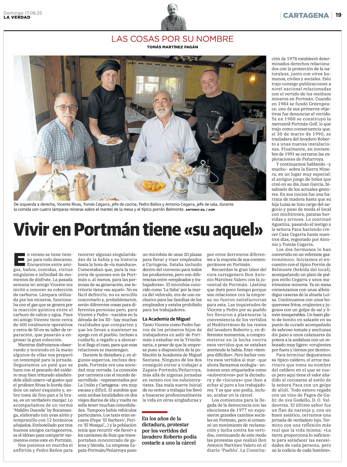 El el título del artículo que ha dedicado Tomás Martínez Pagán a la localidad mediterránea de La Unión en la sección 'Las cosas por su nombre' que escribe con periodicidad semana en el diario La Verdad de Murcia. En un encuentro con Vicente Rivas y Pedro Baños en 'Casa Cegarra' recuerdan diversas secuencias del pasado portmanero, como el microbús 'La Saba', la llegada de la democracia, las protestas contra los vertidos, el antiguo juego de bolos...